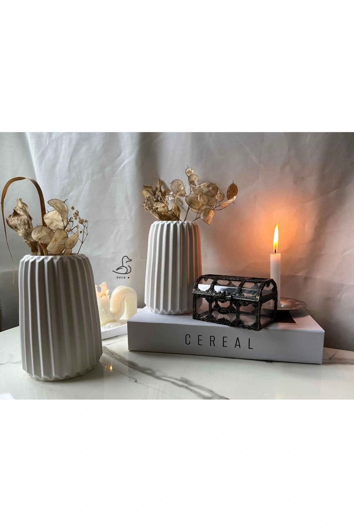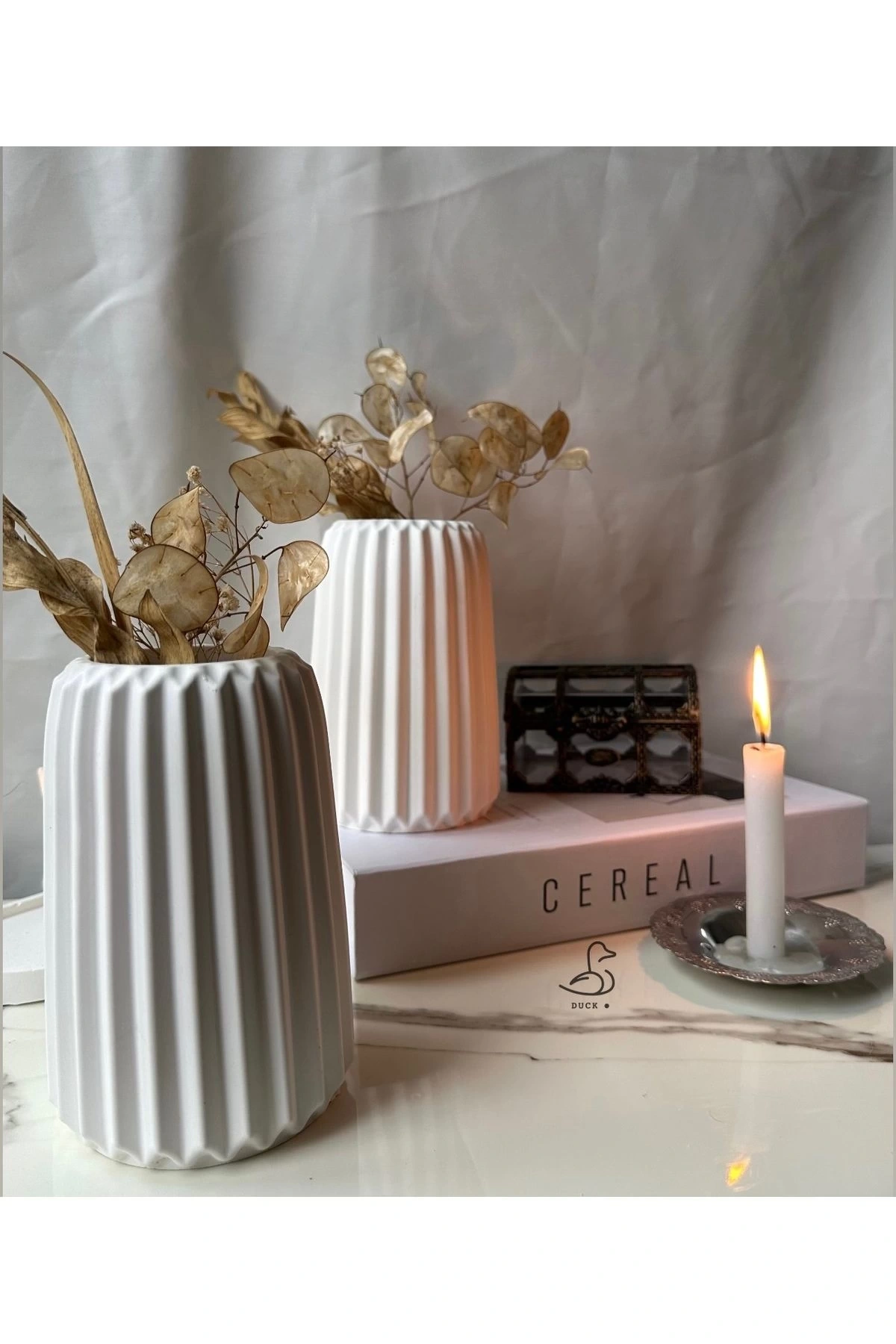 - Zarif beyaz renkteki beton malzemesiyle, her türlü iç mekan dekorasyonuna kolayca uyum sağlar.; - 11 ile 30 cm arasında ayarlanabilir yüksekliği sayesinde farklı alanlarda ideal boyutta kullanılabilir.; - Çizgili deseniyle modern ve şık bir görünüm sunar, evinizin atmosferini canlandırır.; - Tek parça halinde gelen bu vazo, minimalist tasarım severler için mükemmel bir seçenektir.