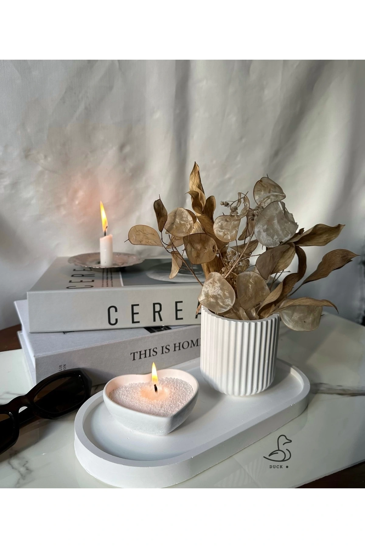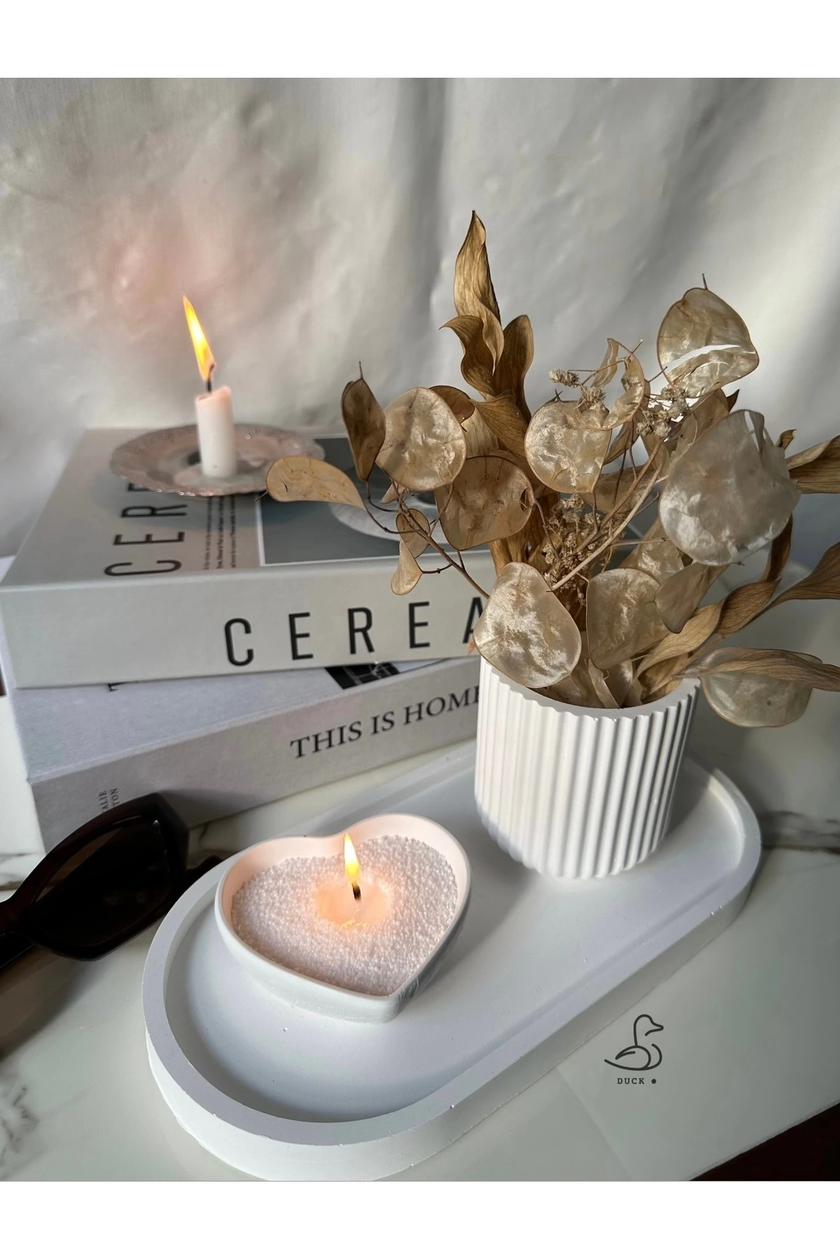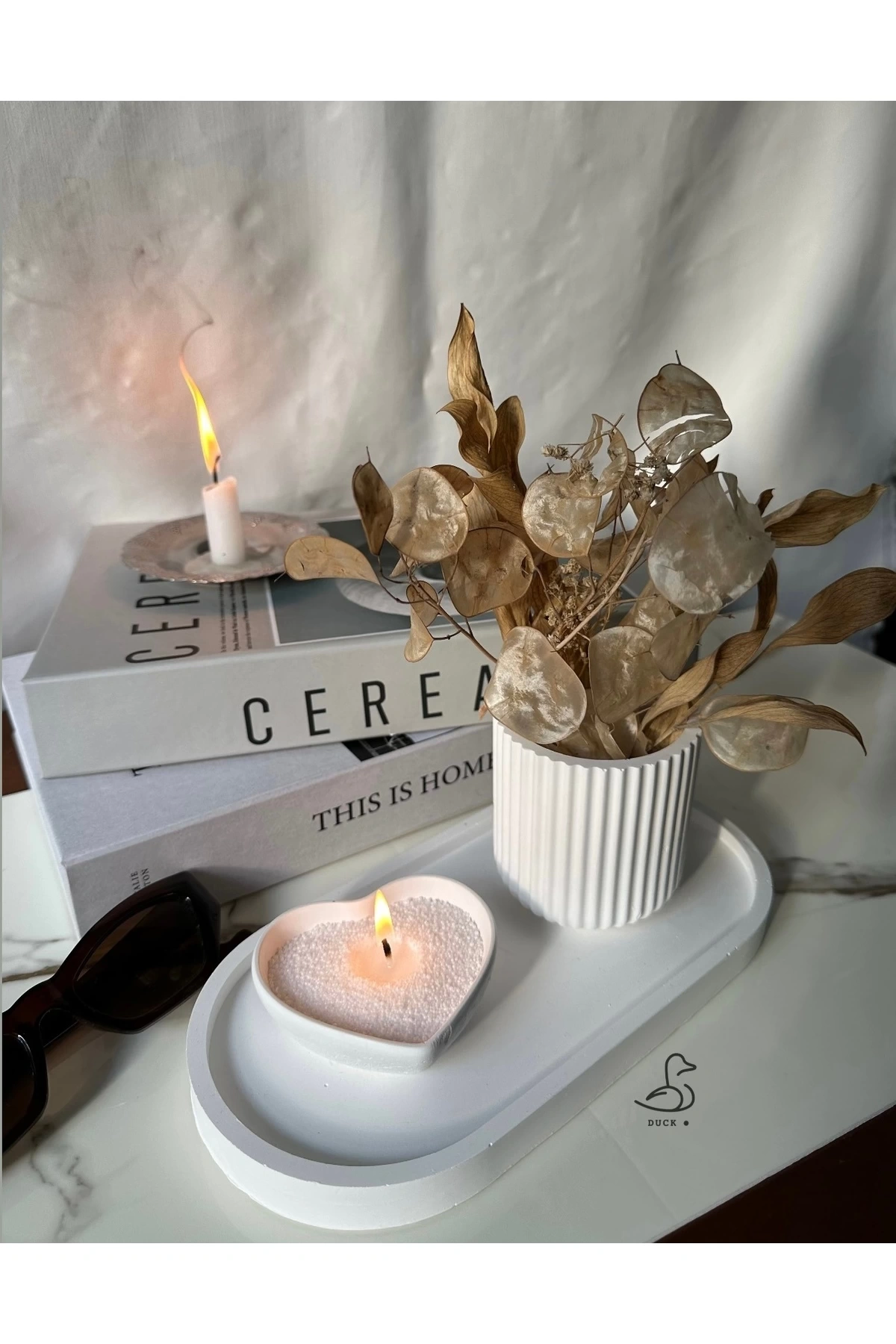 - Modern tasarımıyla dikkat çeken çizgili vazo ve kalp görünümlü inci tozlu mumluk seti, mekanınıza şıklık katıyor.; - Üç parçadan oluşan bu set, her bir parça ile bütünlük sağlayarak dekoratif bir uyum sunuyor.; - Beyaz rengiyle ferahlık veren bu ürünler, her türlü dekorasyon stiline kolayca uyum sağlıyor.; - Taş tozu malzemesiyle dayanıklılığı ve estetiği bir arada sunan bu mumluklar, uzun süreli kullanım için idealdir.; - 10 x 15 cm boyutlarındaki bu mumluklar, hem küçük hem de orta boy mumlar için uygundur ve yer kaplamadan şık bir görünüm sağlar.; - Türkiye'de üretilen bu ürünler, yerel kaynaklı malzemelerle kaliteli bir üretim sürecinden geçmiştir.