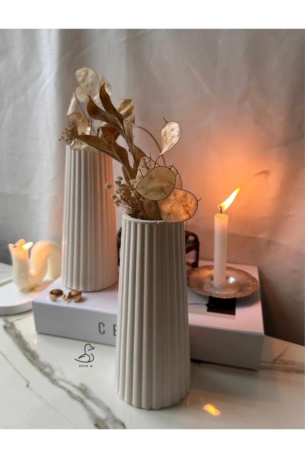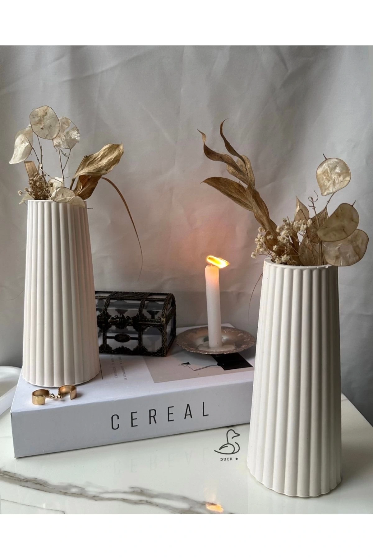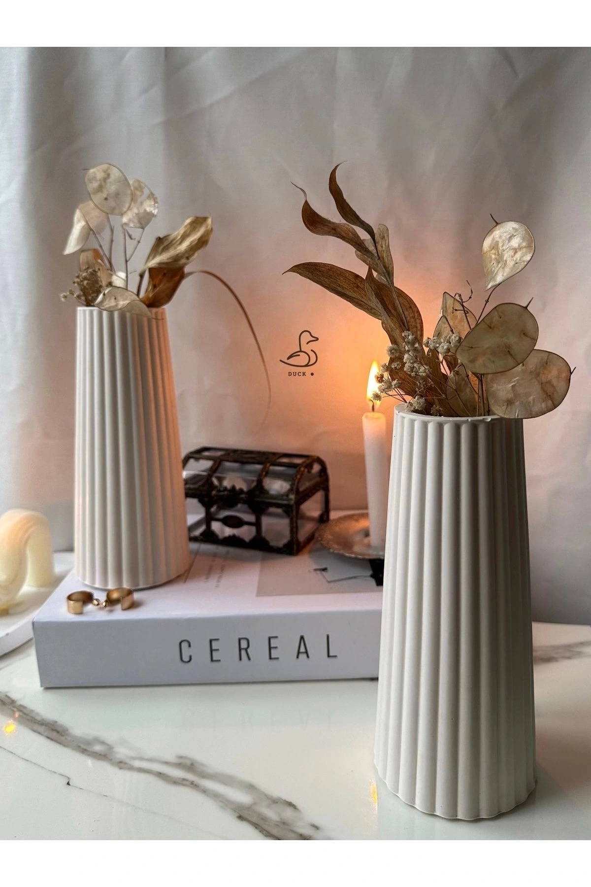 - İki parçadan oluşan bu vazo seti, modern ve şık tasarımıyla mekanınıza estetik bir dokunuş katıyor.; - Türkiye'de üretilen bu beton malzemeden yapılmış olan vazo seti, dayanıklılığı ve kalitesiyle ön plana çıkıyor.; - Beyaz renk seçeneği sayesinde her türlü dekorasyon stiline kolayca uyum sağlayarak mekanınızın atmosferini zenginleştiriyor.; - 11 ila 30 cm arasında değişen yüksekliği ile çeşitli kullanım alanlarına uygunluk gösteriyor; hem duvar süsü hem de masa üstü aksesuar olarak idealdir.