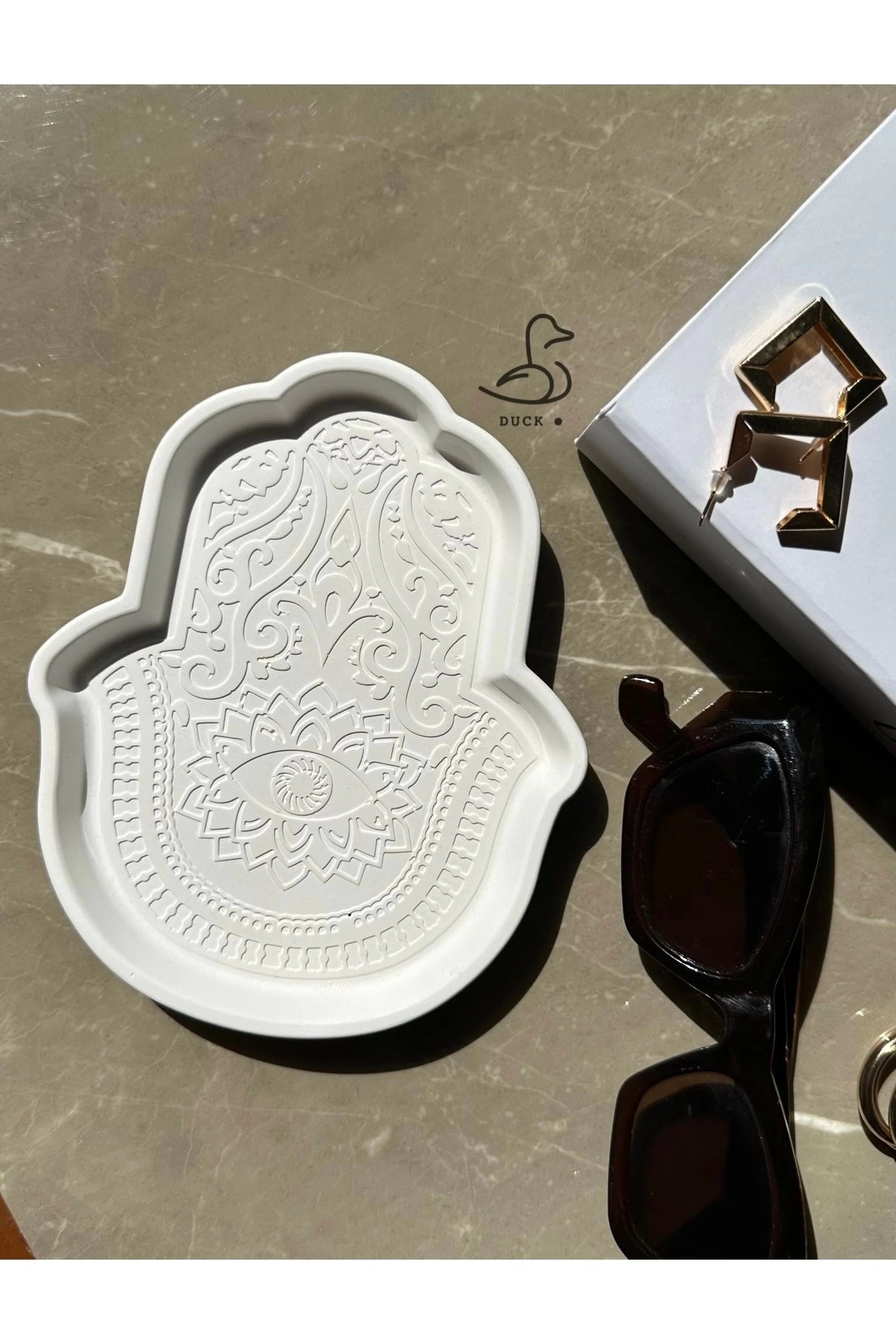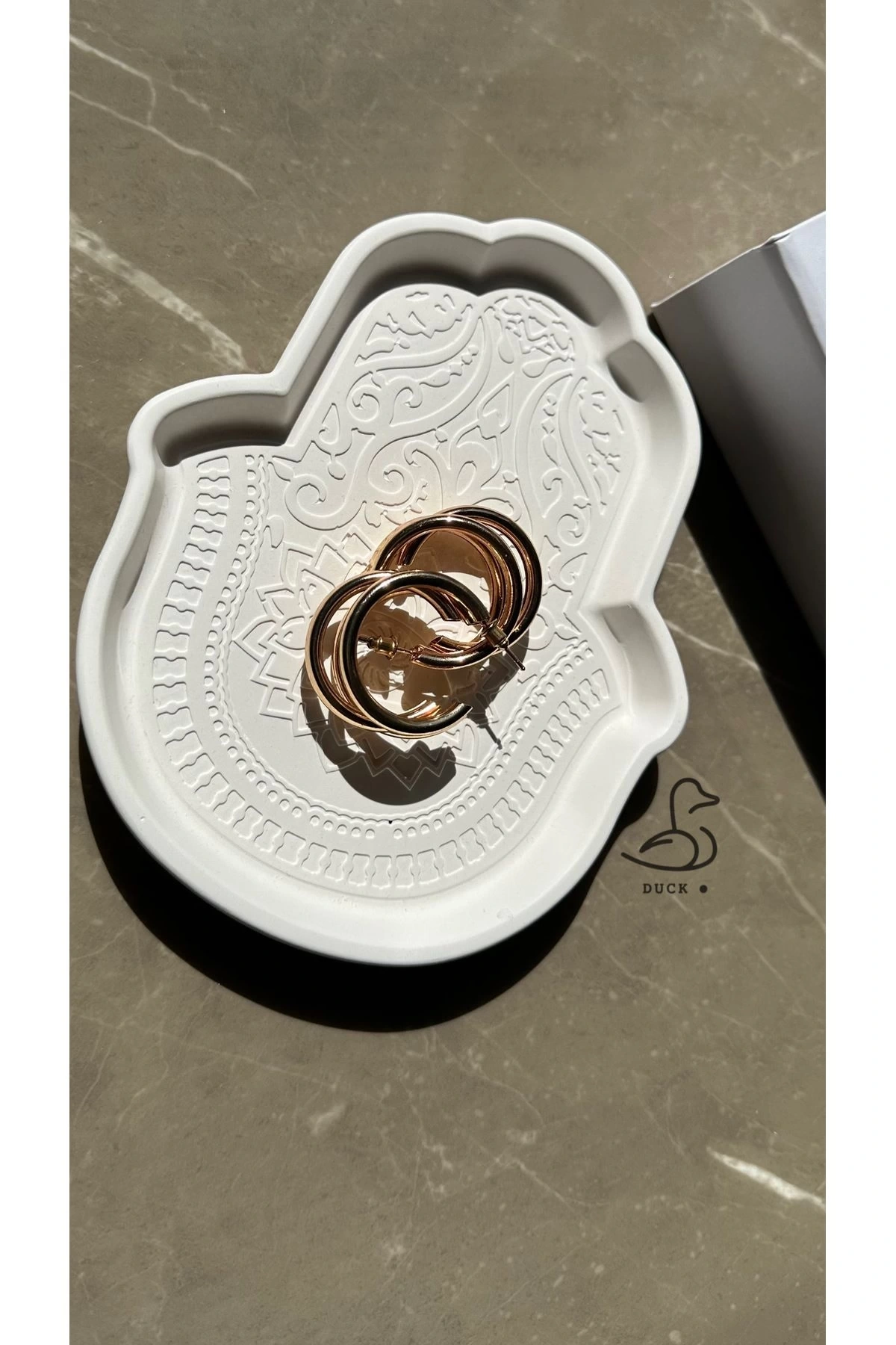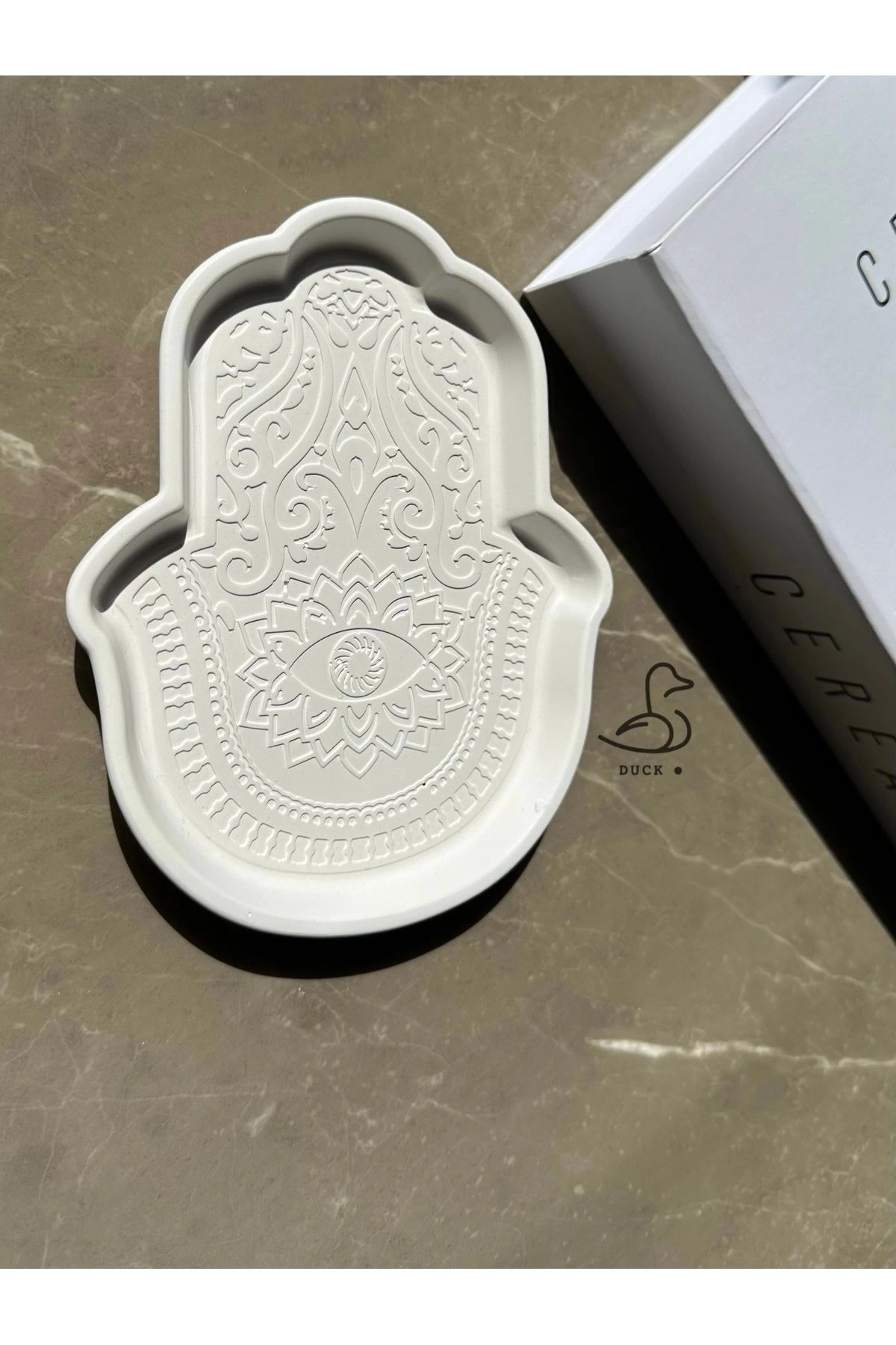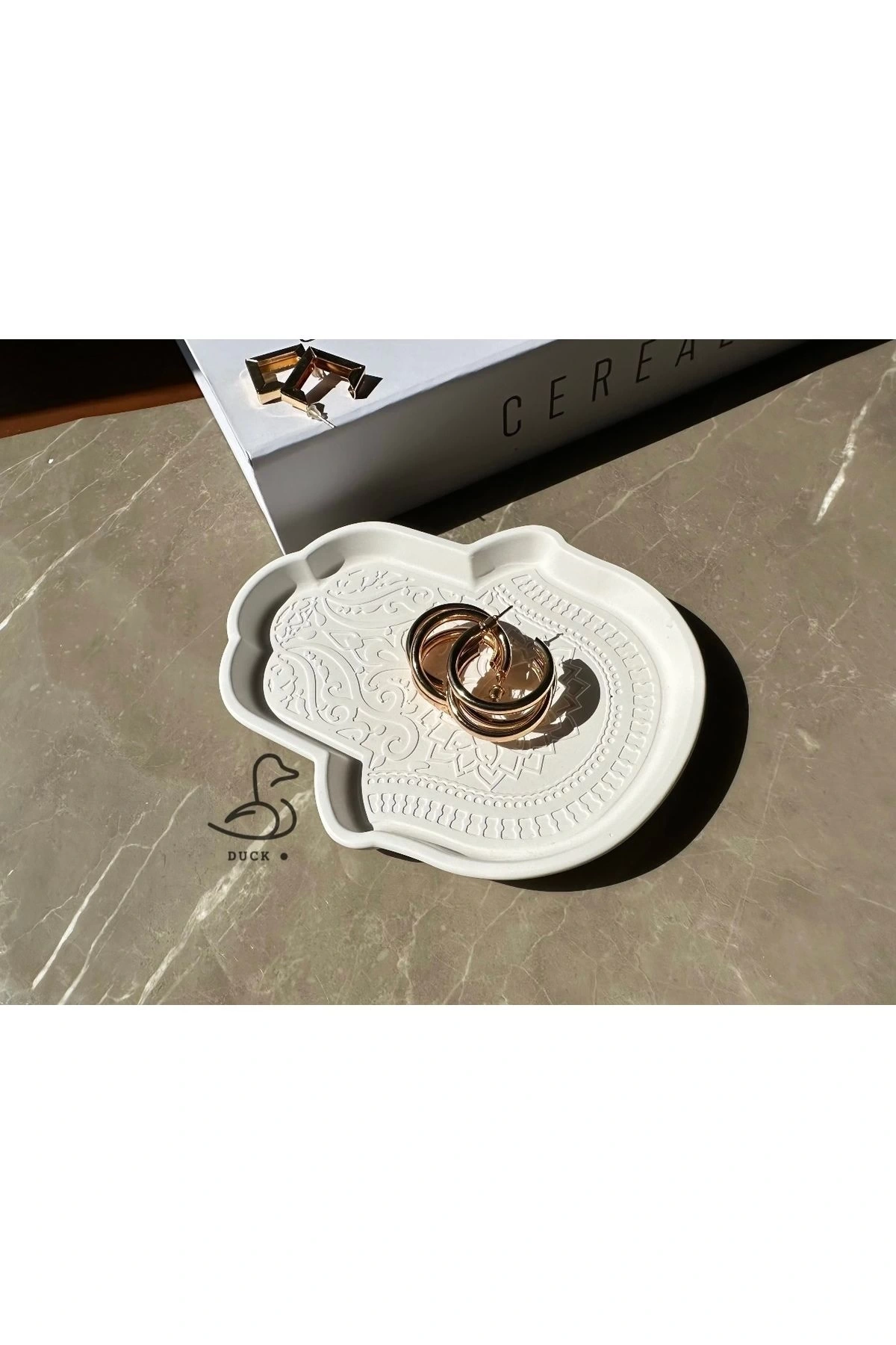 - Modern tasarımıyla dikkat çeken Fatıma'nın Eli, evinizin dekorasyonuna şıklık katar.; - Asimetrik şekliyle geleneksel ve modern çizgileri harmanlayan bu tabak, mekanınıza özgün bir hava kazandırır.; - Beyaz rengi sayesinde her türlü renk paletine kolayca uyum sağlar ve aydınlık bir atmosfer oluşturur.; - 15 x 14 cm boyutlarındaki bu dekoratif tabak, hem küçük sofralarınızda hem de büyük masalarınızda rahatlıkla kullanılabilir.; - Materyalin taş tozu olması, dayanıklılığı ve uzun ömürlü kullanımı garanti ederken, menşeinin Türkiye'den gelmesi yerel üretim tercihlerini destekler.; - Tek parça halinde sunulan bu ürün, minimalist ve fonksiyonel tasarım anlayışına sahiptir.