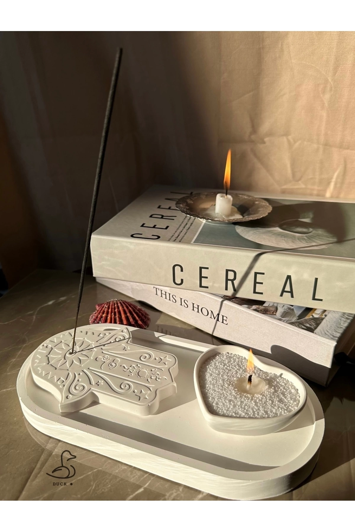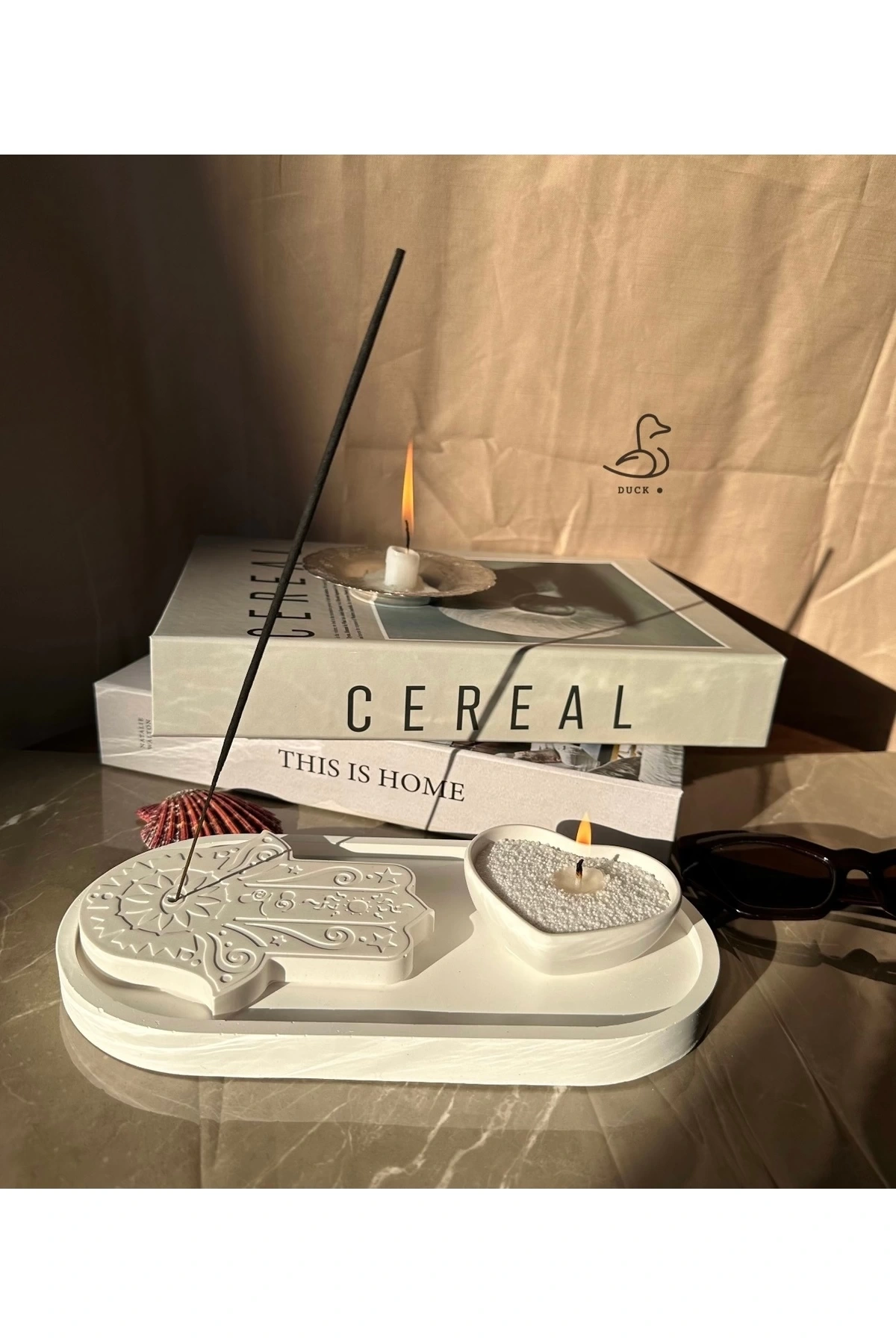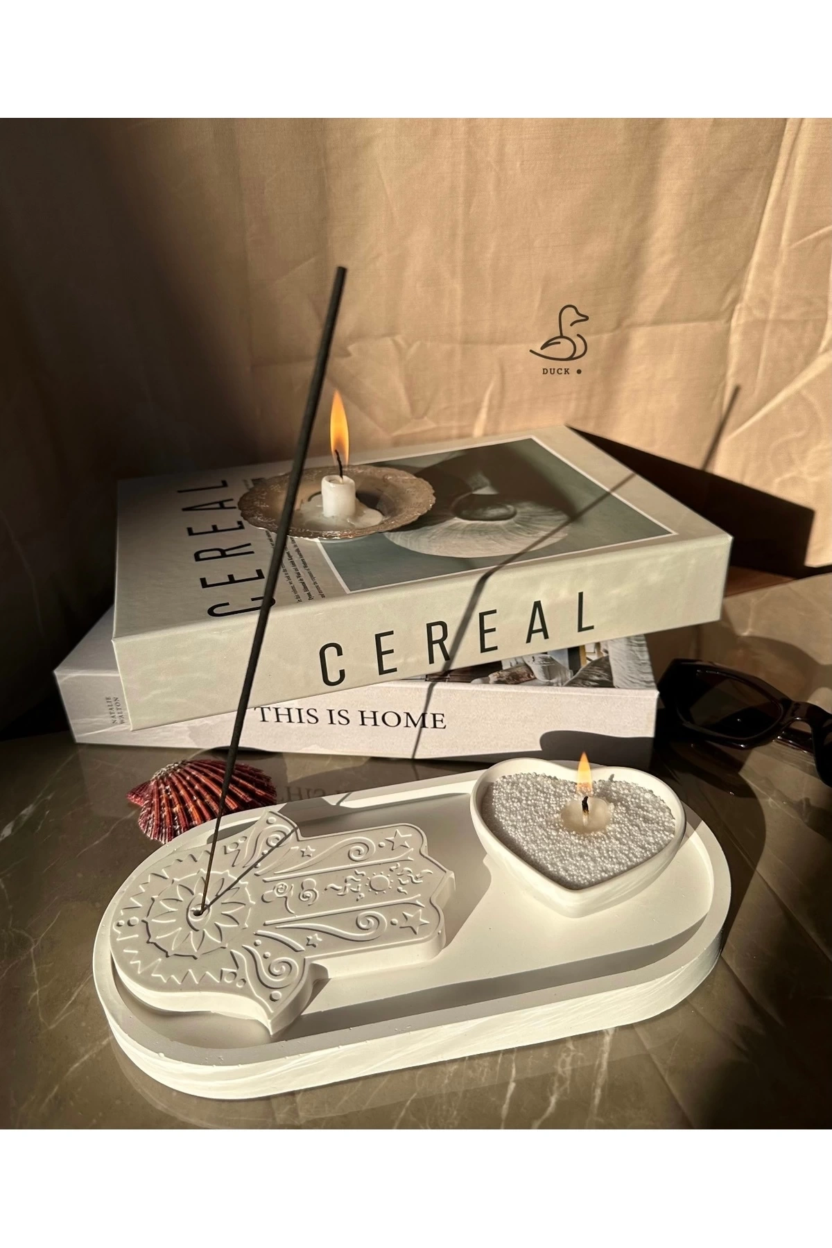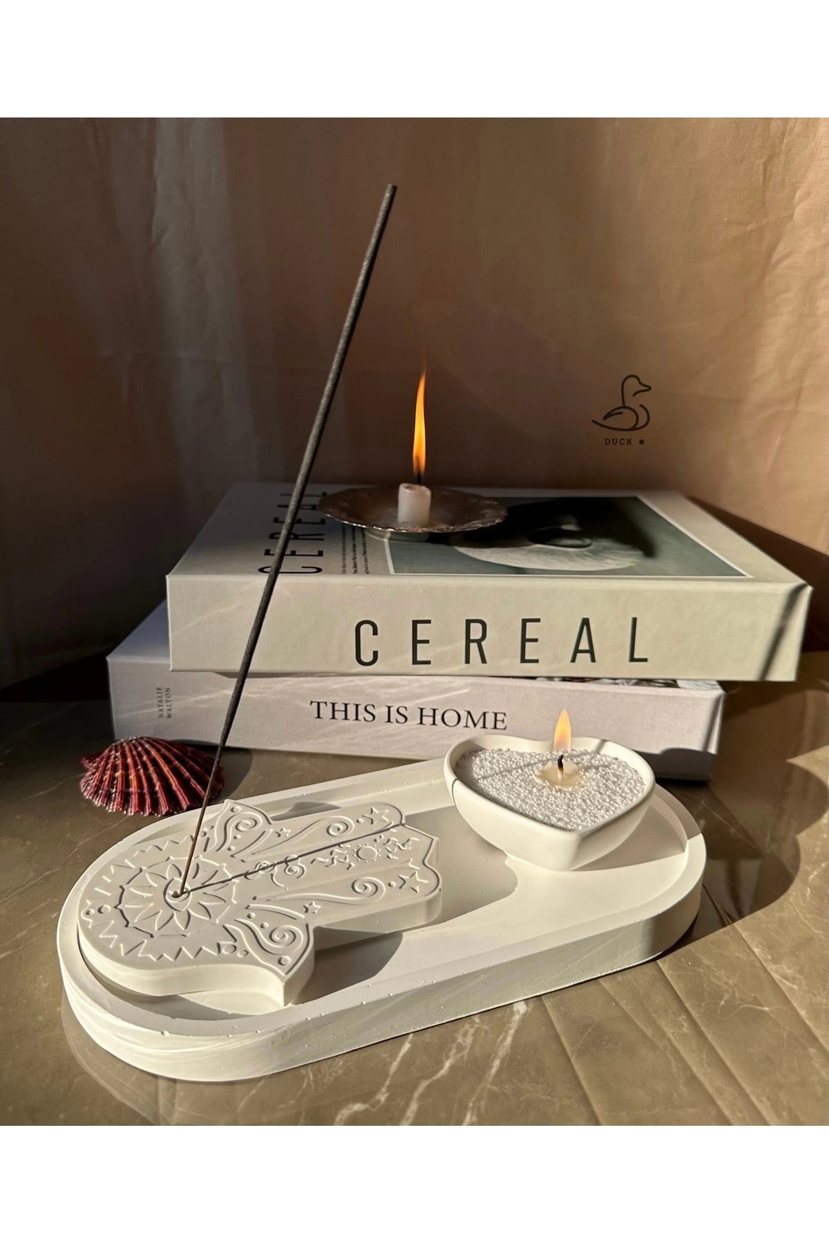 - Modern tasarımıyla dikkat çeken Fatıma'nın eli tütsülük, taş tozu malzemesiyle üretilmiş olup, şık ve zarif bir görünüm sunar.; - Üç parçadan oluşan set, her biri beyaz renkteki inci toz mumlarla birlikte gelir ve evinizin dekorasyonuna sofistike bir dokunuş katar.; -Bu tütsülük, hem estetik hem de fonksiyonel bir kullanım sağlar; modern stil sahibi bireyler için idealdir.; - Türkiye'de üretilen bu ürün, yerel zanaatkarların el emeğiyle hazırlanmış olup, evinizin atmosferini zenginleştirir.; - mumların doğal ve sıcak kokusu, mekanınıza huzur ve dinginlik katarak rahatlatıcı bir ortam yaratır.