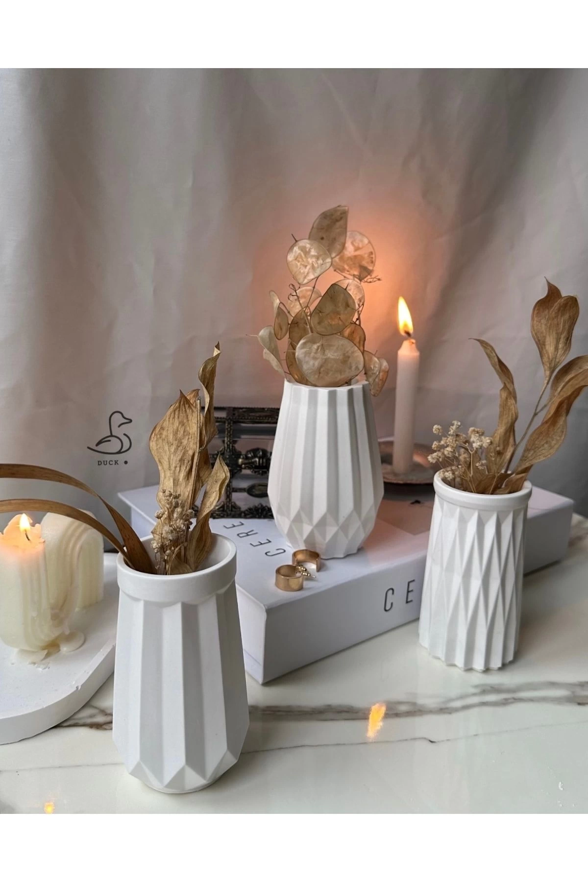 - Modern ve şık tasarımıyla dikkat çeken geometrik desenli 3'lü vazo seti, mekanınıza estetik bir dokunuş katıyor.; - Dayanıklı beton malzemesi sayesinde uzun ömürlü kullanım sunar ve her türlü iç mekan dekorasyonuyla uyum sağlar.; - Beyaz rengiyle ferahlık veren bu vazo seti, minimalist ve sade dekorasyon tarzını benimseyenler için idealdir.; - 11-12 cm arasında değişen yükseklikleriyle farklı boyutlardaki bitki ve çiçekler için uygun yerleştirme imkanı sunar.
