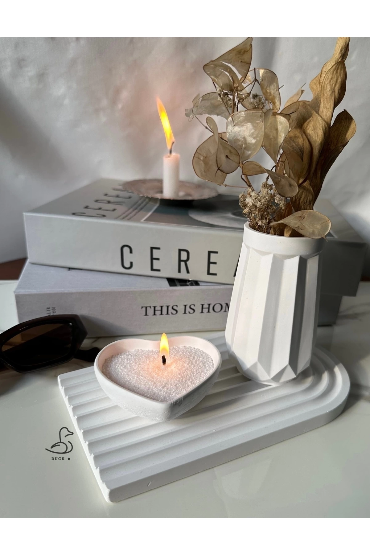 - Modern tasarımıyla dikkat çeken geometrik desenli vazo ve kalp görünümlü inci tozlu mumluk seti, evinizin dekorasyonuna şıklık katıyor.; - Üç parçadan oluşan bu set, taş tozu malzemesiyle hem dayanıklı hem de estetik bir görünüm sunuyor.; - Beyaz rengiyle her türlü mekana uyum sağlayarak, zarif ve sade bir atmosfer yaratıyor.; - 18 x 15 cm boyutlarındaki bu ürünler, hem küçük hem de orta boyutlu alanlar için idealdir.; - Türkiye'de üretilen bu mumluk seti, yerel üreticilerin kalitesini ve detaylara gösterilen özeni yansıtıyor.