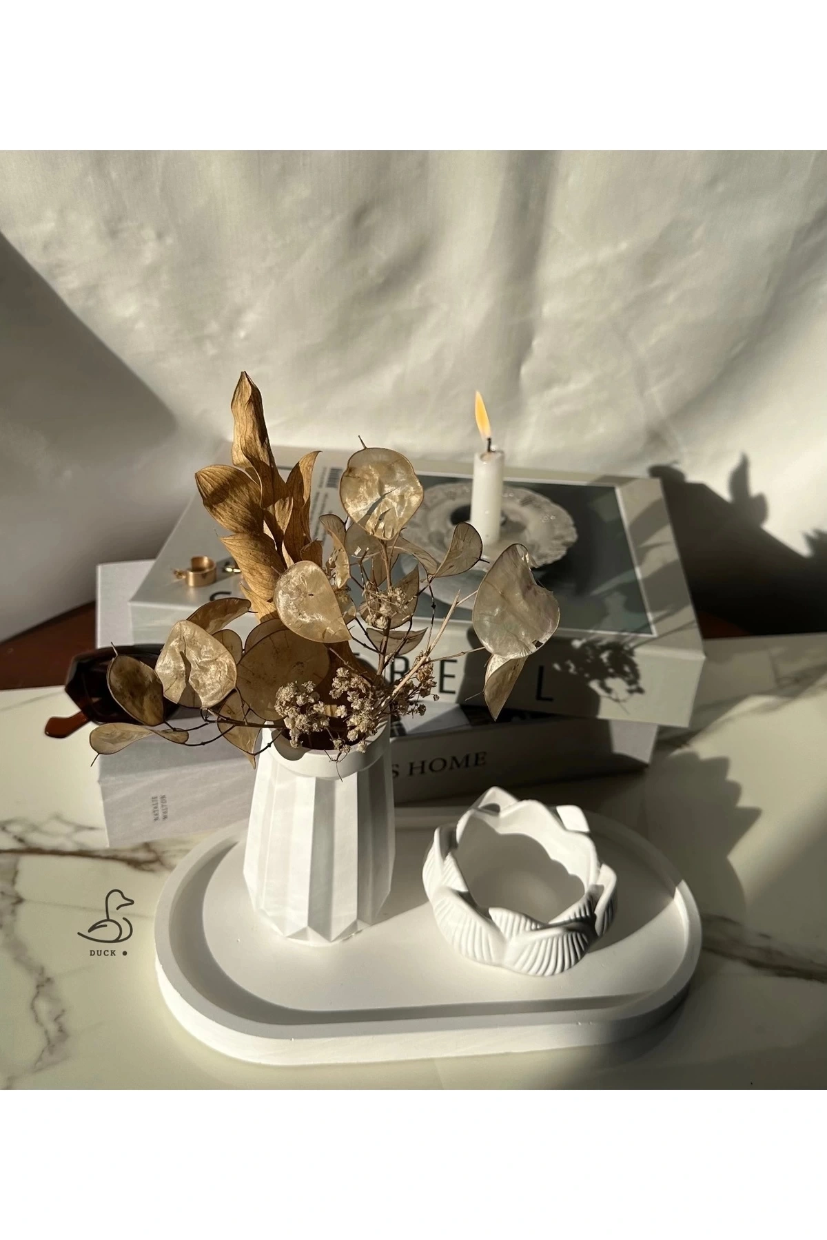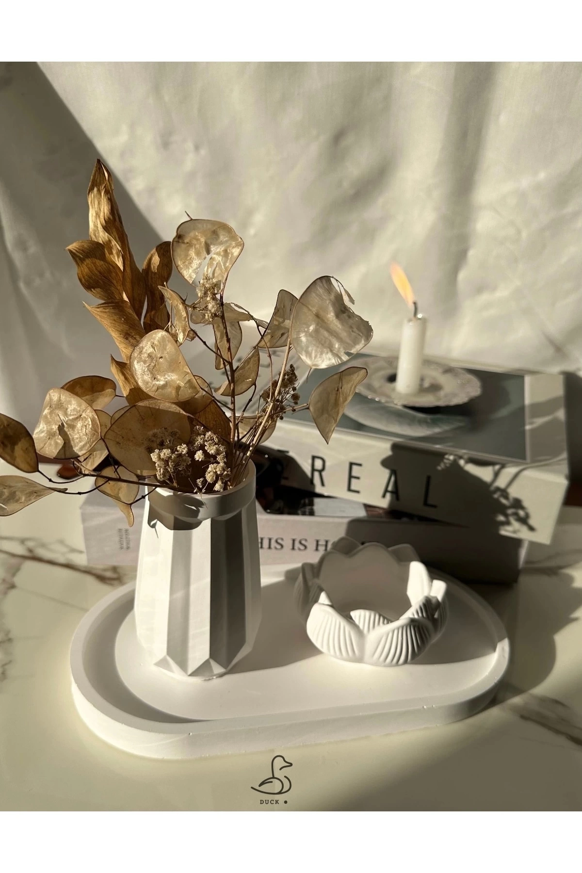 • Casa di Duck tasarımı: Modern çizgilerle hazırlanmış geometrik vazo ve lotus formundaki dekoratif mumluk/objeden oluşan özel set.