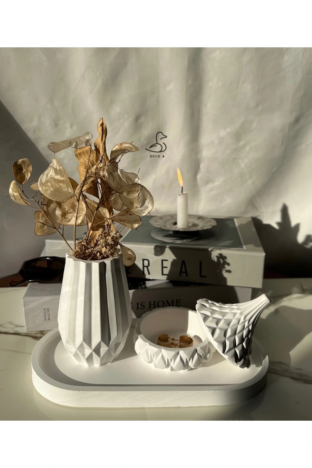 - Modern tasarımıyla dikkat çeken geometrik vazo ? ve işlemeli takı kutu seti, her türlü dekorasyona şıklık katar.; - Üç parçadan oluşan bu set, taş tozu materyaliyle hem dayanıklı hem de estetik bir görünüm sunar.; - Beyaz rengiyle mekanınıza ferahlık getiren bu ürünler, geometrik desenleriyle modern stilinizi yansıtır.; - 10 x 15 cm boyutlarındaki vazo ve takı kutusu, küçük ama etkili bir dekoratif dokunuş sağlar.; - Türkiye'de üretilen bu set, yerel zanaatkarların el işçiliğini ve kalitesini evinize taşır.