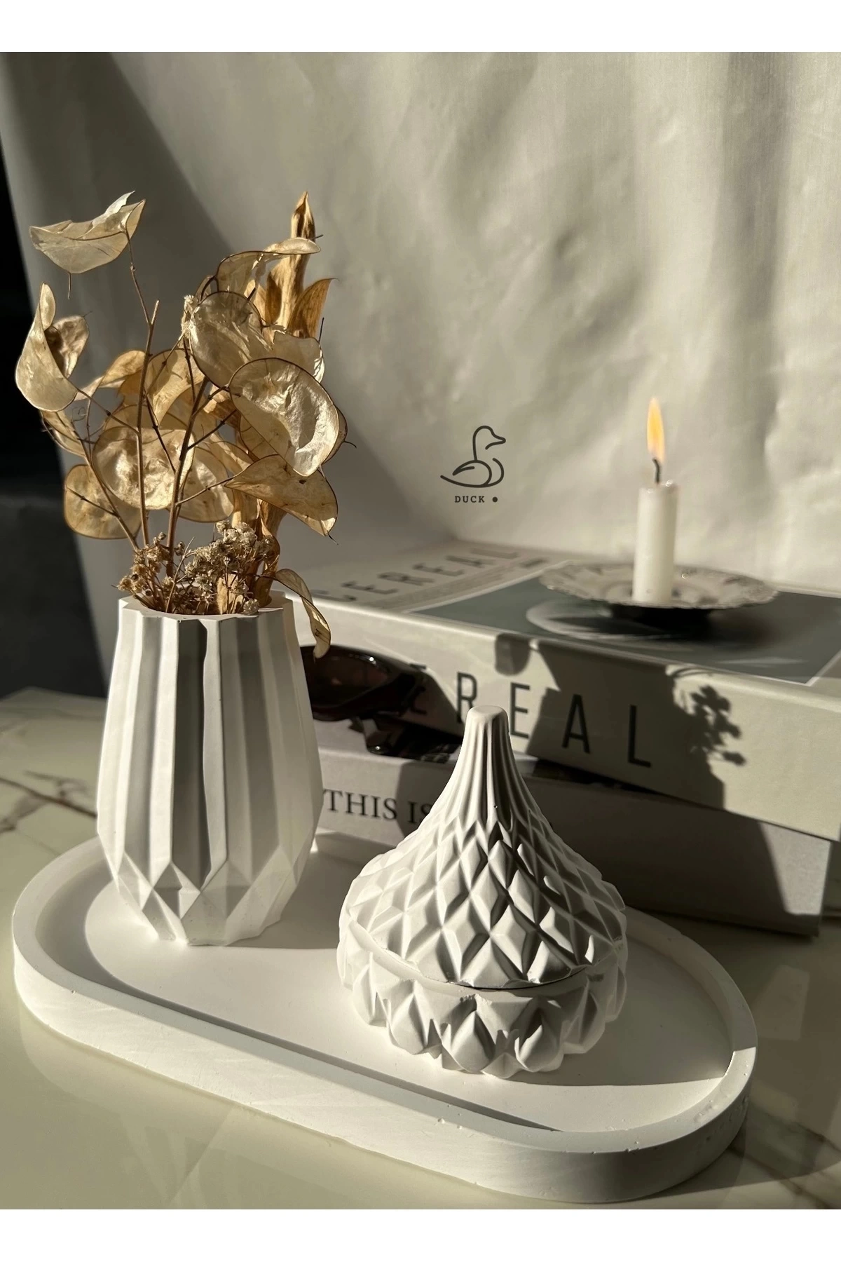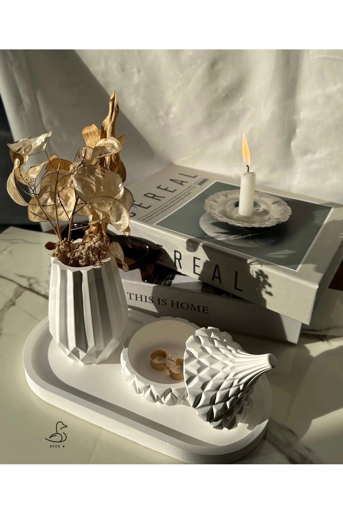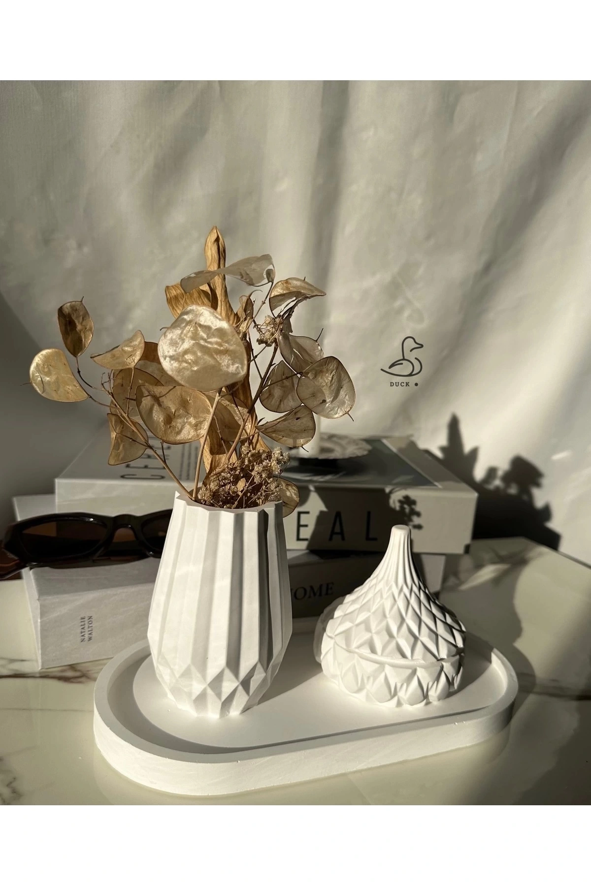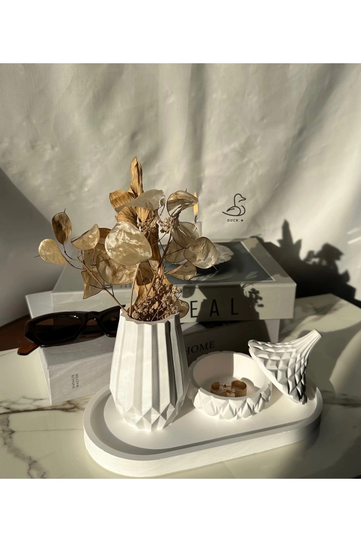 • Casa di Duck tasarımı: Modern çizgilerle hazırlanmış geometrik vazo ve özel işleme detaylı takı kutusu/objeden oluşan şık dekoratif set.