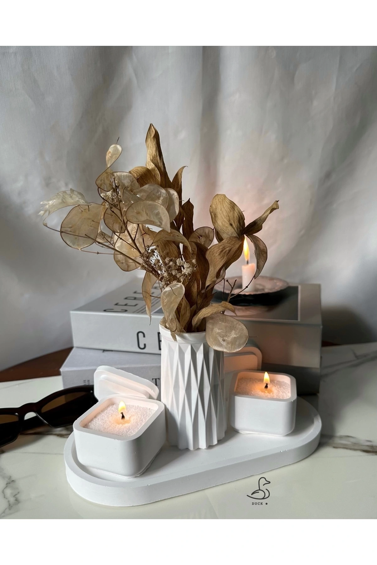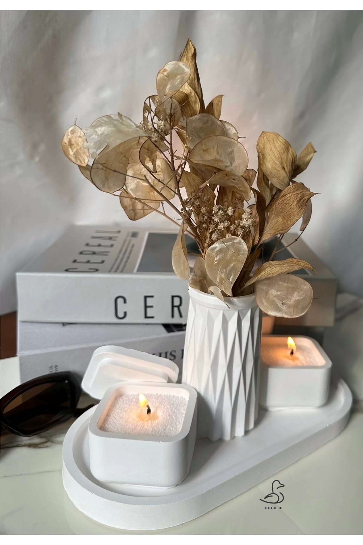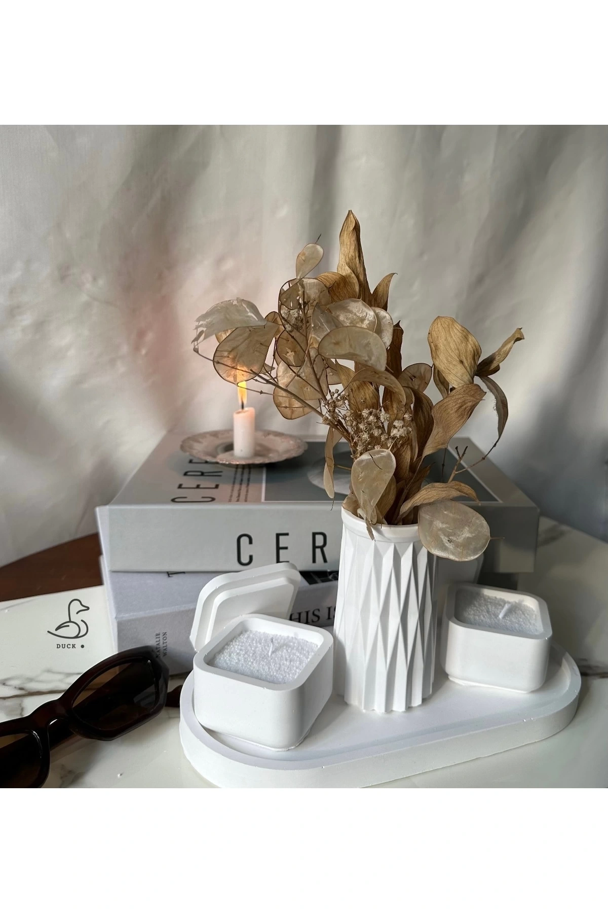 - Modern tasarımıyla dikkat çeken bu set, geometrik desenleriyle mekanınıza şıklık katıyor.; - Taş tozu malzemesi sayesinde dayanıklılık ve uzun ömürlü kullanım sunuyor.; - Beyaz rengiyle her türlü dekorasyona kolayca uyum sağlayarak evinizin atmosferini aydınlatıyor.; - 18 x 15 cm boyutlarındaki bu mumluk ve vazo, ideal boyutlarıyla hem kullanışlı hem de estetik bir görünüm sağlıyor.; - Türkiye'de üretilen bu ürün, yerli üretim kalitesiyle evinizde fark yaratmanızı sağlıyor.