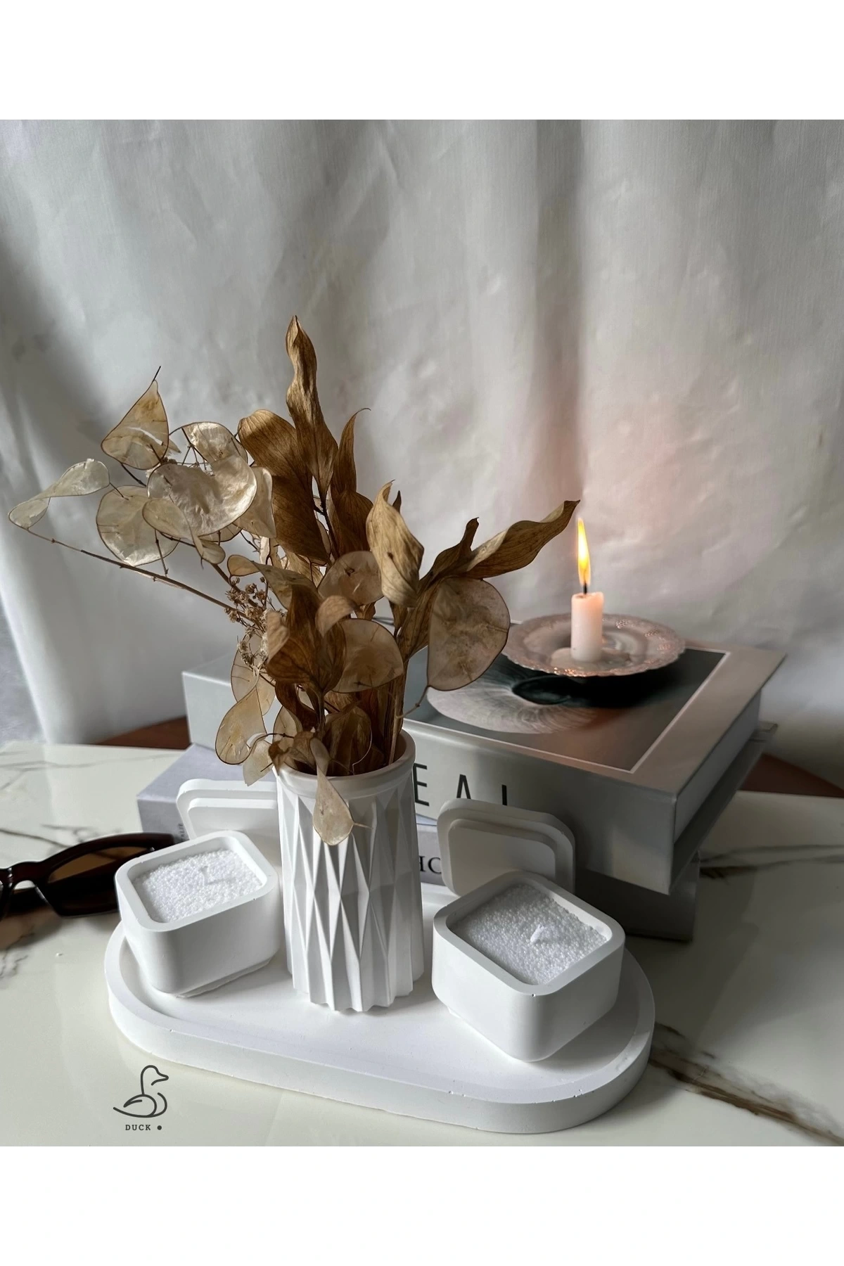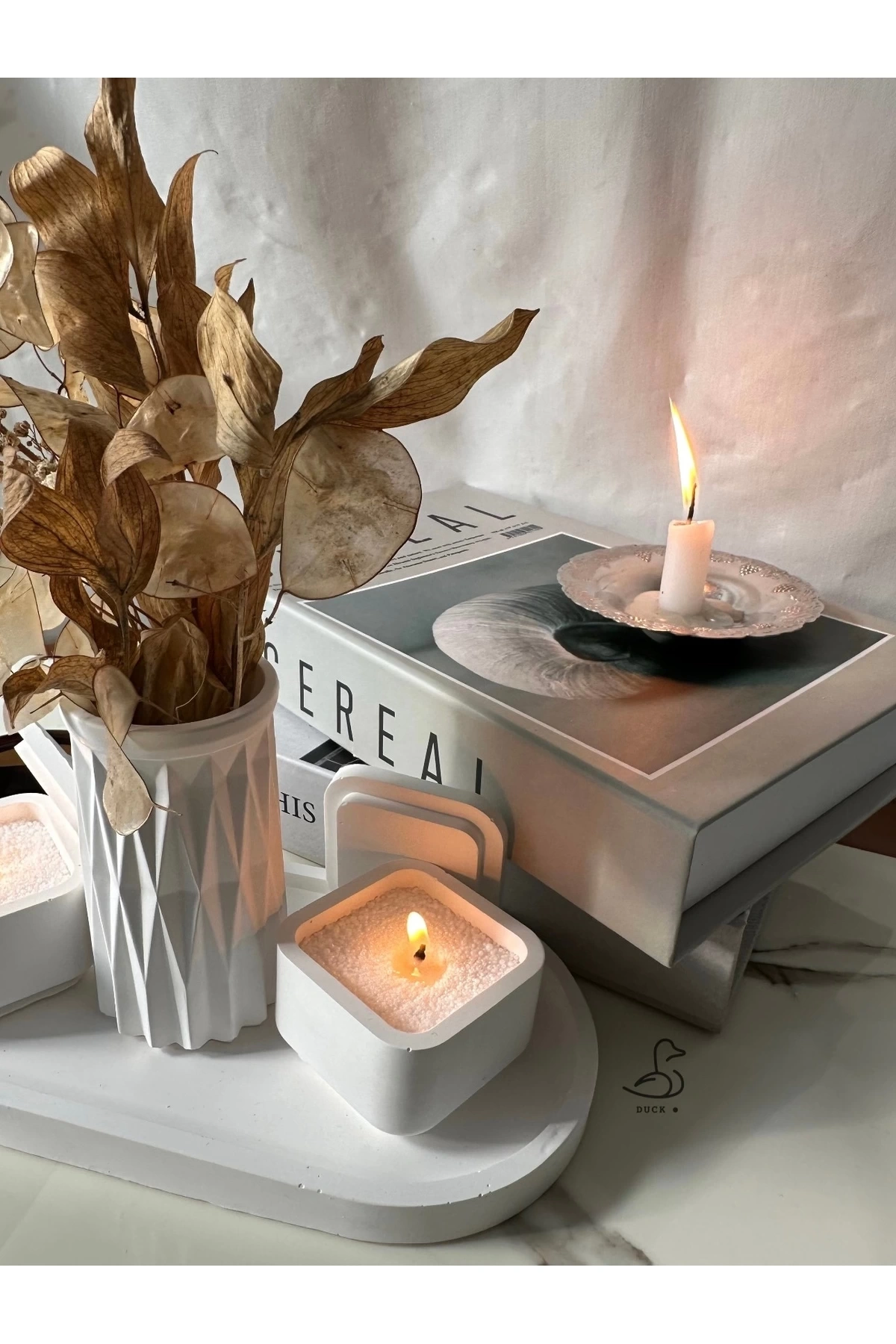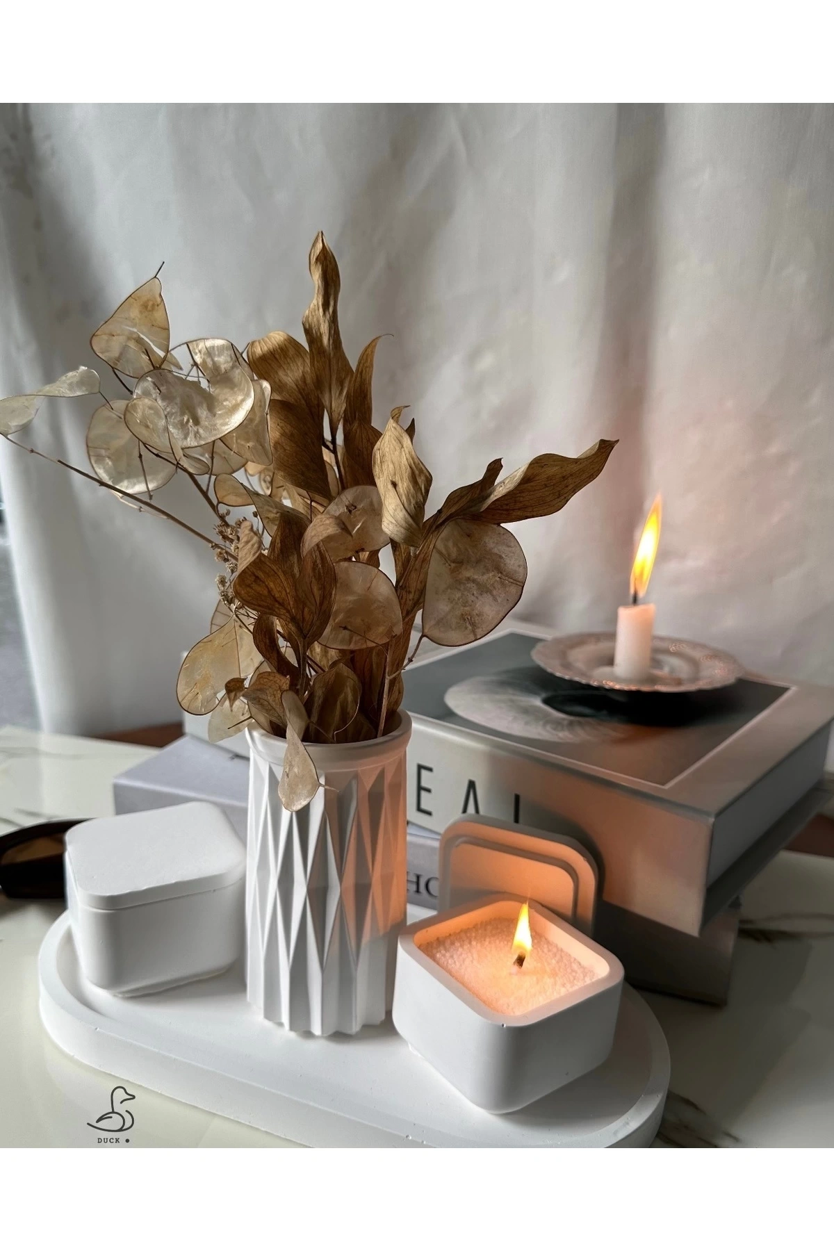 - Modern tasarımıyla dikkat çeken bu set, geometrik desenleriyle mekanınıza şıklık katıyor.; - Taş tozu malzemesi sayesinde dayanıklılık ve uzun ömürlü kullanım sunuyor.; - Beyaz rengiyle her türlü dekorasyona kolayca uyum sağlayarak evinizin atmosferini aydınlatıyor.; - 18 x 15 cm boyutlarındaki bu mumluk ve vazo, ideal boyutlarıyla hem kullanışlı hem de estetik bir görünüm sağlıyor.; - Türkiye'de üretilen bu ürün, yerli üretim kalitesiyle evinizde fark yaratmanızı sağlıyor.