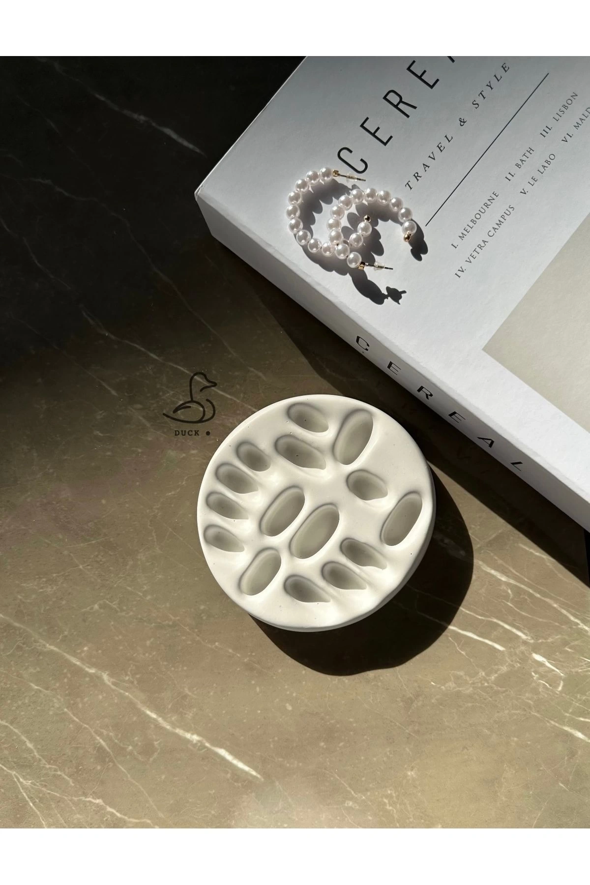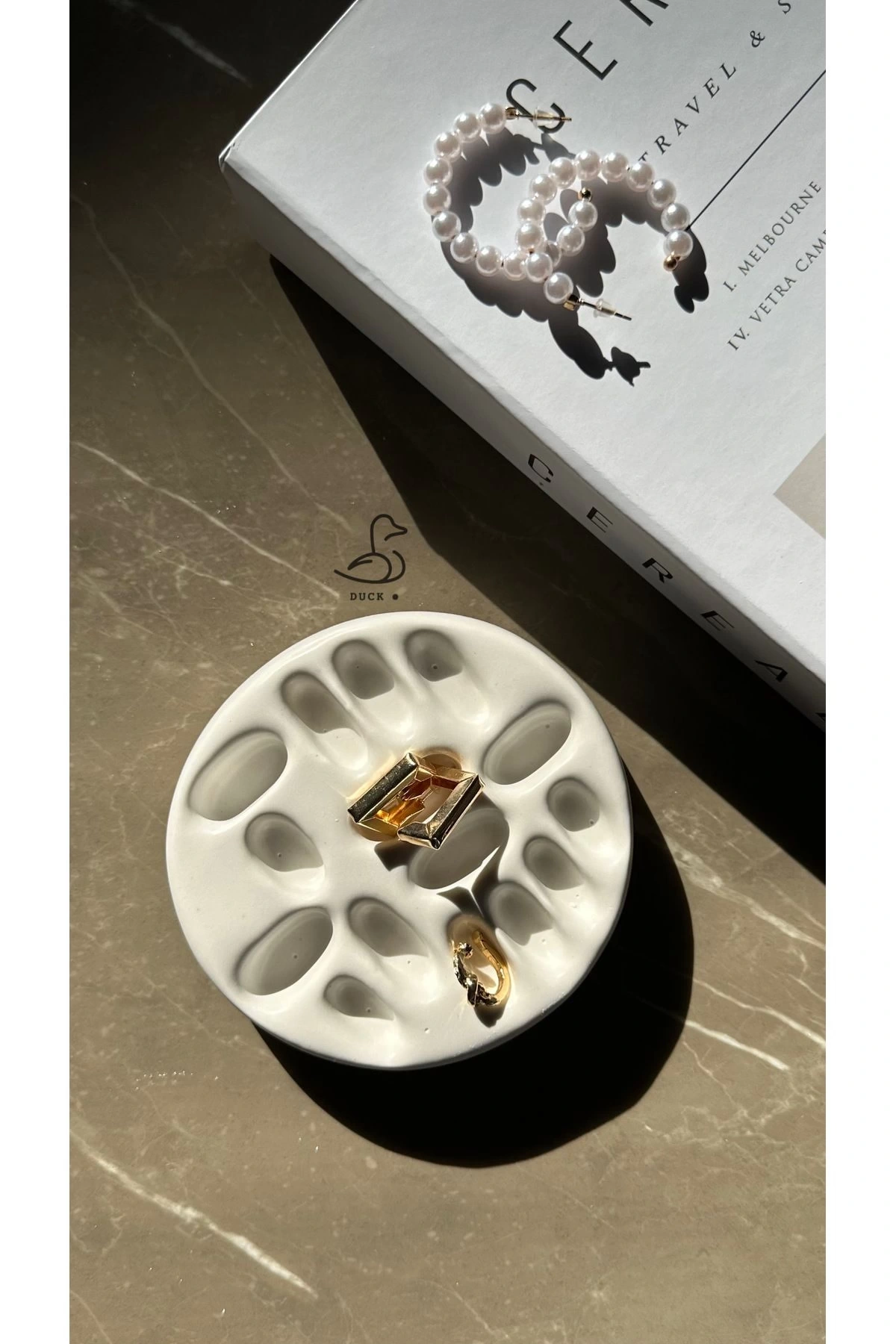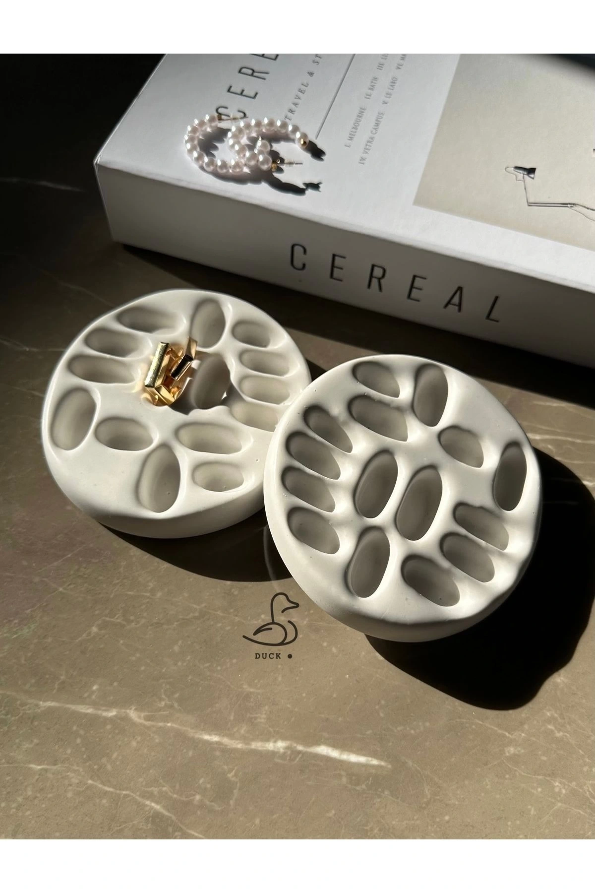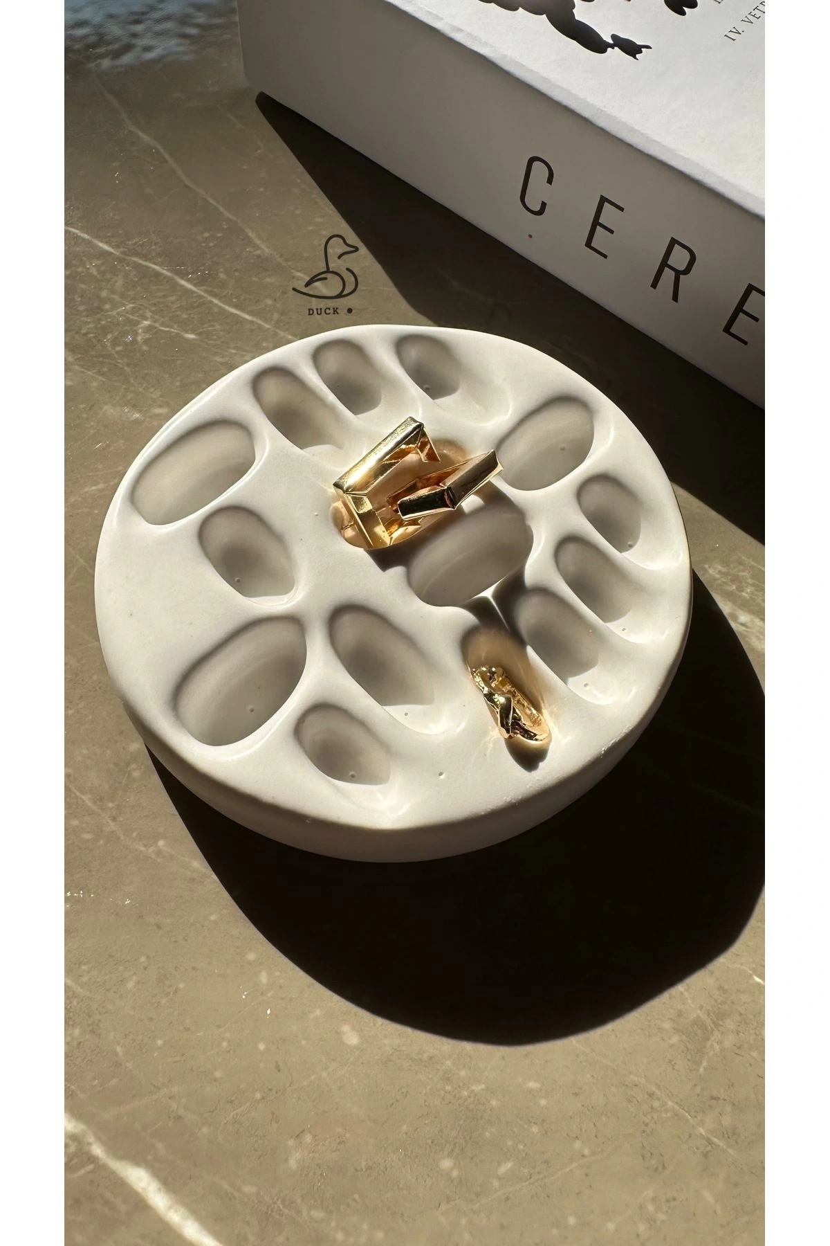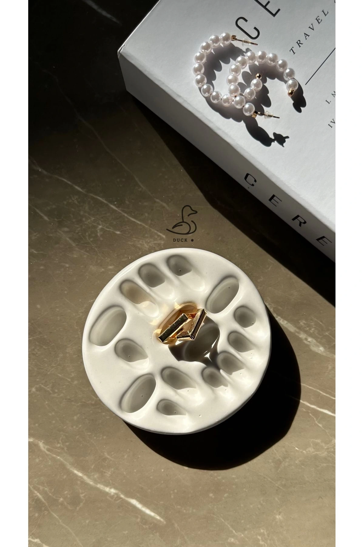 - Yuvarlak tasarımı ile modern dekorasyon anlayışına uyum sağlar ve mekanınıza şık bir dokunuş katar.; - Beton malzemesi sayesinde dayanıklı yapısıyla uzun süreli kullanım sunar.; - Beyaz rengiyle her türlü iç mekan paletine kolayca uyum sağlayarak estetik bir görünüm oluşturur.; - 15 x 15 cm boyutlarındaki bu yüzük standı, küçük alanlarda bile rahatça kullanılabilir.; - Modern tema ve stil özellikleriyle çağdaş tasarım severlerin beğenisine sunulmuştur.