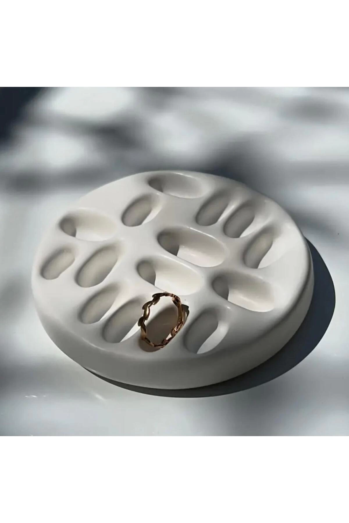 - Geometrik tasarımıyla modern ve şık bir görünüm sunar.; - Dayanıklı beton malzemesi uzun ömürlü kullanım vaat eder.; - Yuvarlak formu ile her türlü yüzük ve aksesuarınızı sergilemek için idealdir.; - Tek parça halinde kolayca taşınabilir.; Çap 11 cm Yükseklik 1.5 cm